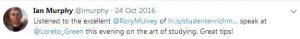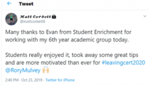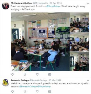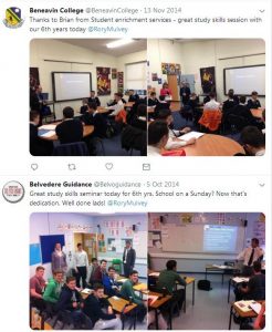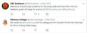 Ger Butler, St Joseph’s College, Lucan.“The study skills workshops went very well. Thanks to you and the two guys who presented.”